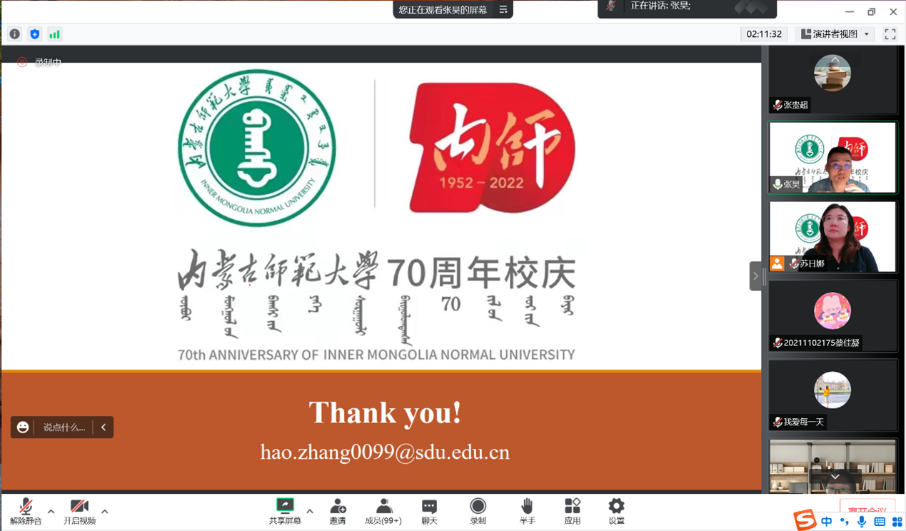 太阳成集团tyc33455ccwww喜迎太阳集团tyc3345570周年校庆青年学者学术讲座的第二场于2022年8月3日成功举办,由山东大学太阳成集团tyc33455ccwww张昊副教授主讲,讲座题目为“什么是言语感知加工?── 从语音学说起”。本场讲座由英语系主任苏日娜老师主持, 英语系教师及200余名学生共同聆听了此次讲座。