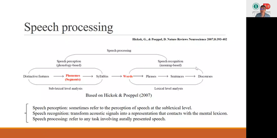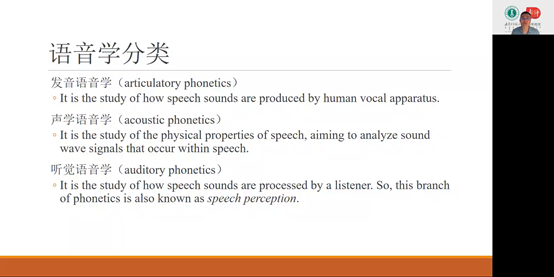 在讲解言语识别(speech recognition)部分,张昊博士结合生活实例同师生分享了几个有趣的语音理论知识,如音位恢复效应(phonemic restoration effect),词汇识别转换效应(lexical identification effect)和McGurk效应(McGurk effect),阐释这几个不同的语音效应在言语感知过程中所发挥的重要的作用。在讲座的最后一部分,张昊博士重点介绍了言语感知运动理论(Motor Theory)和母语磁极理论(Native Language Magnet Theory-expanded (NLM-e)),进一步地提升了师生对语音学理论的认识。