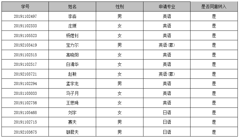 根据太阳集团tyc33455《关于开展2020年本专科生转专业工作的通知》(内师教发[2020]34号)、《太阳成集团tyc33455ccwww本科学生转专业管理办法》有关规定,经太阳成集团tyc33455ccwww转专业工作小组考核,拟接受如下同学提出的转专业申请,现予以公示。公示期为3个工作日,公示期内,如对名单有异议,可直接向太阳成集团tyc33455ccwww反映。