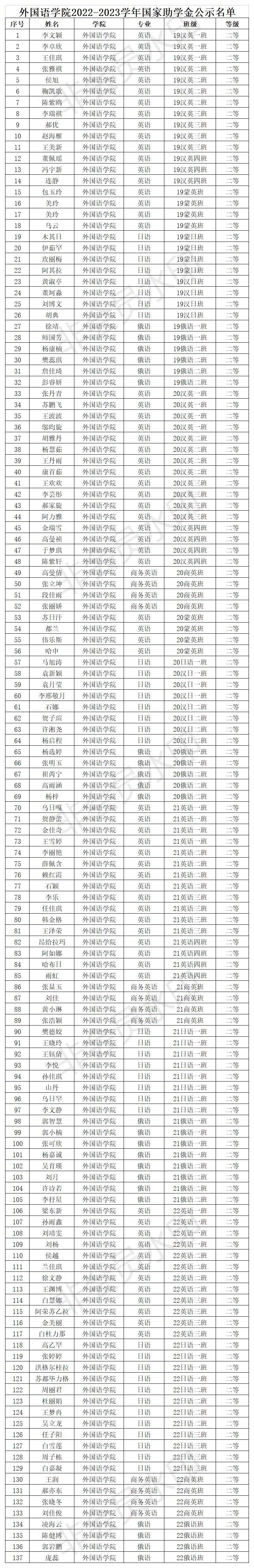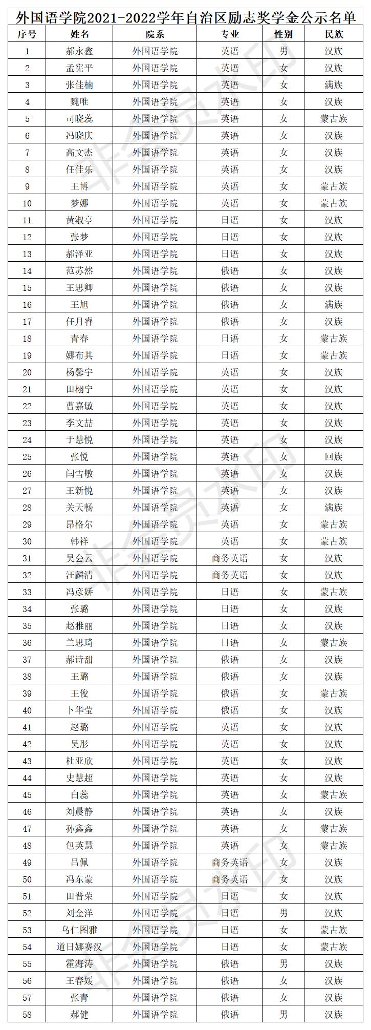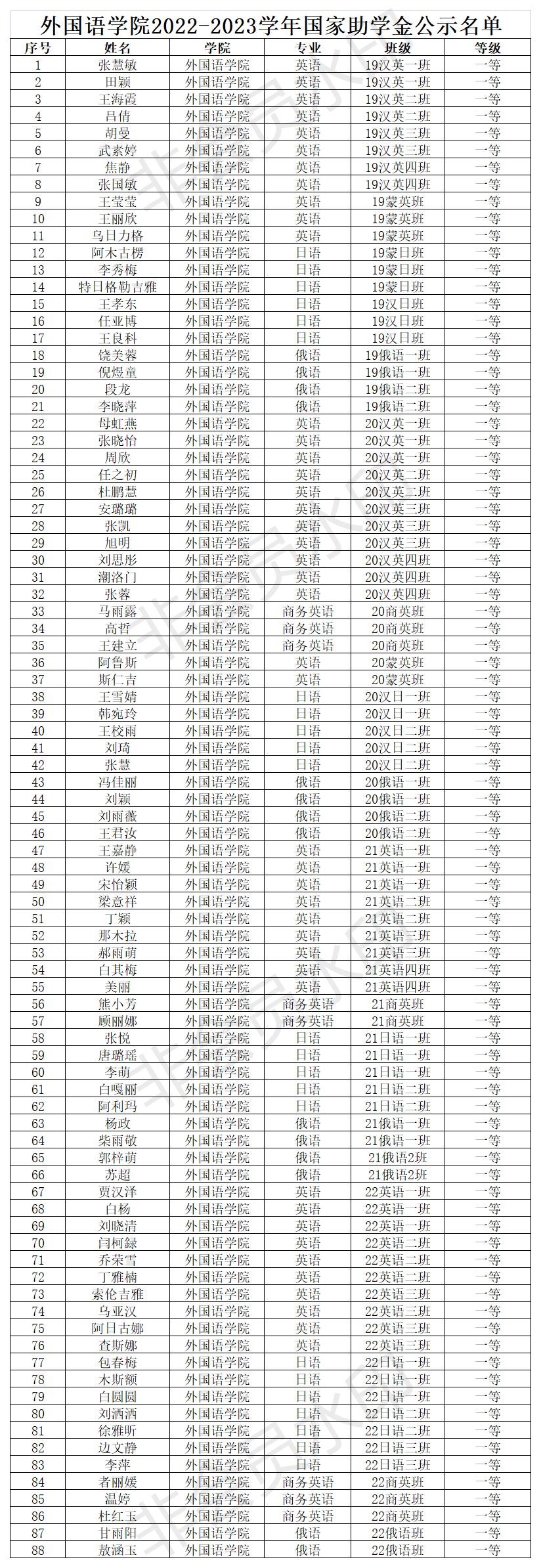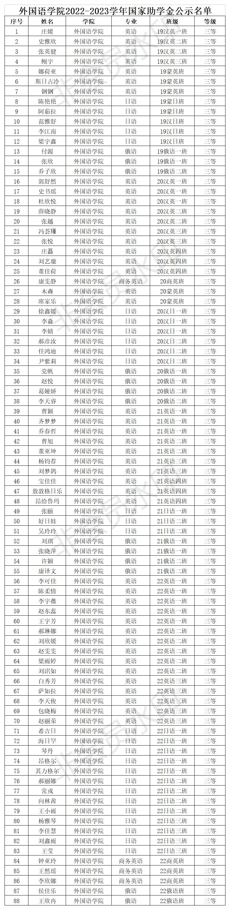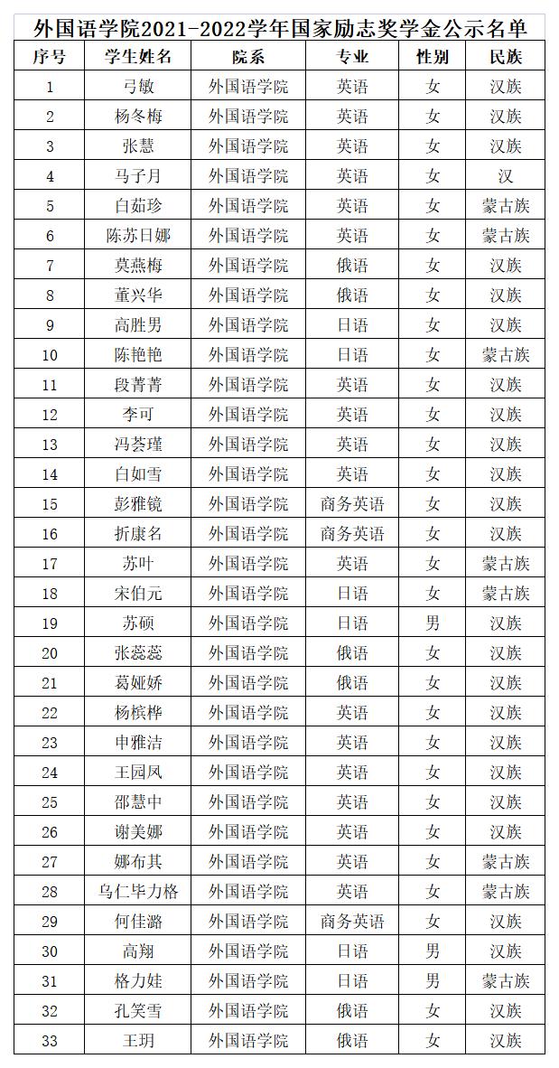 根据关于印发《太阳集团tyc33455国家励志奖学金、国家助学金评选管理暂行办法》的通知(校发〔2015〕73号),《关于印发<太阳集团tyc33455自治区励志奖学金评选暂行办法>的通知》(内师校发〔2021〕66 号),《关于开展 2021-2022 学年自治区励志奖学金评审工作的通知》(校学发〔2022〕19 号),以及《关于开展 2021-2022 学年国家励志奖学金、2022-2023 学年国家助学金评审工作的通知》(校学发〔2022〕17 号)等文件精神,我院组织开展了评选工作。经学生本人申请、班级评审小组审核、班主任审核、学院评审委员会评选,最终确定拟推荐人选名单(国家励志奖学金33人,自治区励志奖学金58人,国家助学金一等88人、二等137人、三等88人)。为体现公开、公平、公正的原则,现将拟推荐名单予以公示3天。如有异议,请来电或来信反映。