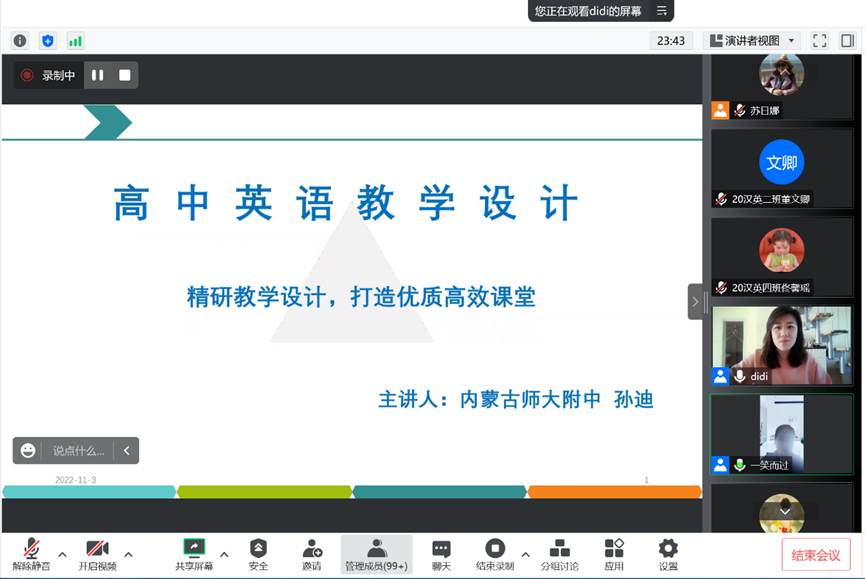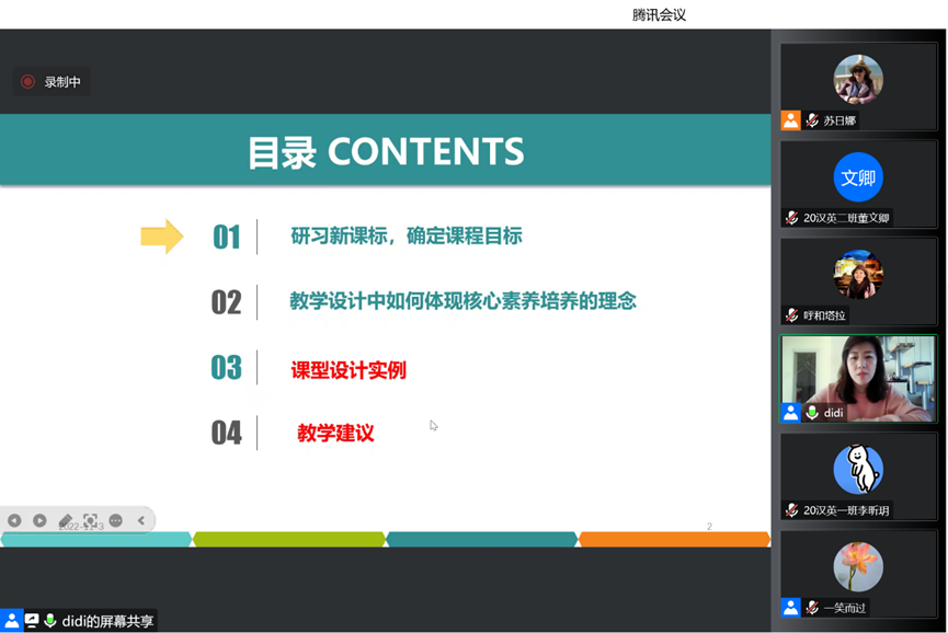 第三场讲座由呼和浩特市赛罕区教育教学研究中心中学英语教研员黄晓燕老师主讲,英语系呼和塔拉老师主持,英语系教师团队教师、2020级全体本科生和学科教学研究生聆听了讲座。黄老师详实的文本资料、热情的讲解、精炼的语言使整场讲座理论深厚,深入浅出,听众受益匪浅。