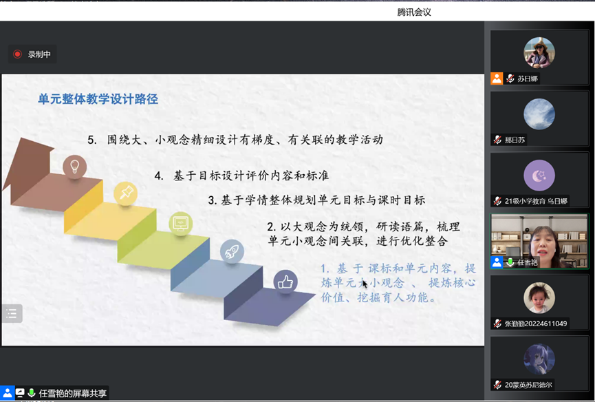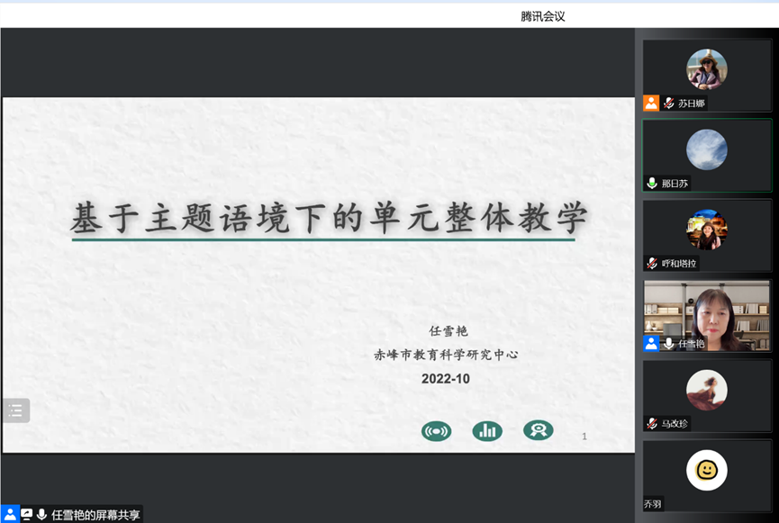 2022年10月20日下午,赤峰市教育教学研究中心英语教研员任雪艳老师做了题为《基于主题语境下的单元整体教学》的线上讲座,副院长那日苏主持讲座,英语系教师教育团队全体教师,2019级、2020级全体本科生以及部分研究生参加。