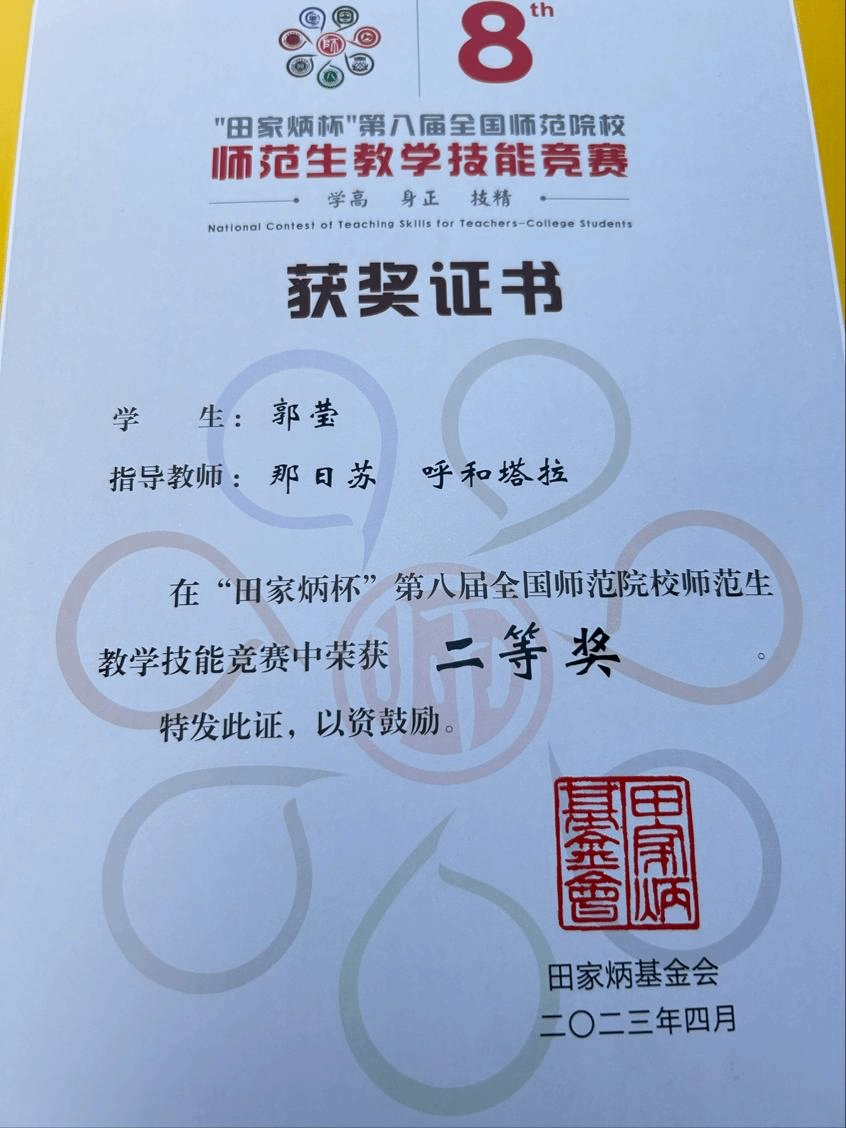 近日,“田家炳杯”第八届全国师范院校师范生教学技能竞赛决赛在浙江师范大学举行,我院英语专业学生郭莹在历经学校初赛和全国复赛后,成功入围现场决赛,并在决赛中荣获二等奖。